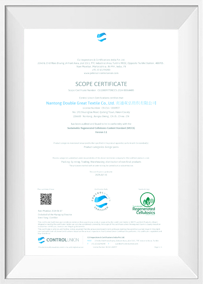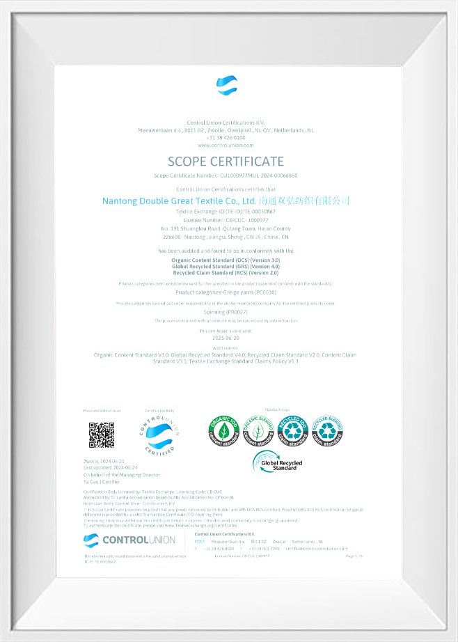 La qualità e la protezione ambientale sono i nostri impegni per i nostri clienti. A tal fine, abbiamo ottenuto una serie di certificazioni autorevoli per garantire la qualità e la protezione ambientale di ogni lotto di prodotti. I nostri filati rispettosi dell'ambiente hanno superato rigorosi test e certificazione, tra cui il sistema di gestione ambientale ISO 14001, i test professionali e la certificazione di filati antibatterici e antistatici, ecc. Ciò non solo verifica la nostra capacità di innovazione, ma riflette anche il nostro impegno per la produzione ecologica di alto livello. .