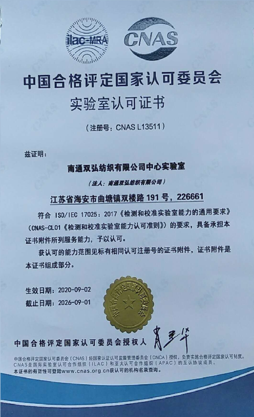 Dall'introduzione dell'accreditamento dei CNA, Il laboratorio centrale di doppia compagnia ha continuamente migliorato vari elementi di gestione, audit interni organizzati e revisioni di gestione. Dopo più di due anni di attività, la maturità di gestione è stata continuamente migliorata. In Luglio 2020 , CNAS Gli esperti di accreditamento hanno condotto un audit in loco del laboratorio centrale di Double Great Company. Il gruppo di esperti ha affermato pienamente le capacità di gestione efficienti del laboratorio, i documenti manuali completi e il funzionamento e i test standardizzati. In settembre 2020 , il laboratorio centrale di doppia società ha superato con successo la revisione degli esperti e ottenuto i CNA certificato. Ciò indica che le capacità di test dei prodotti in fibra e filato doppia della grande azienda sono state riconosciute dallo stato e i dati di test sono più autorevoli.