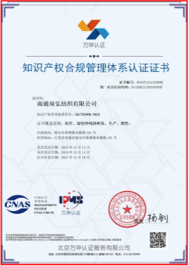 La certificazione del sistema di gestione della conformità della proprietà intellettuale è un'attività di valutazione di conformità in cui un organo di certificazione di terze parti valuta il sistema di gestione della proprietà intellettuale interna di un'impresa per confermare che soddisfa i requisiti degli standard nazionali o delle specifiche tecniche pertinenti. Al momento, Double Great Company ha 5 marchi registrati nazionali e 2 marchi registrati internazionali di Madrid. Il doppio grande marchio è un noto marchio in Cina; Ha più di 50 brevetti di invenzione nazionale e brevetti modello di utilità e ha vinto il premio Gold di brevetto tessile cinese; Ha intrapreso 4 progetti nazionali Torch e 5 Spark Plan; Ha formulato 3 standard nazionali, 11 standard del settore, 4 standard di gruppo e 3 standard di consumo di unità commerciale di elaborazione doganale; Ha effettuato ricerche universitarie industriali e 5 principali progetti tecnologici e di risultati scientifici e tecnologici hanno vinto il secondo premio del settore scientifico e tecnologico del settore tessile cinese.